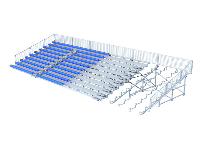 產品特點:主要結構(橫梁、立柱)以矩形管組焊成型,搭配異型輥壓背板及角鋼副支撐,讓看臺在較大跨度的同時依然能保證結構的穩定性和牢靠性,看臺技術成熟,是室內外長期使用的中型看臺需求首選。